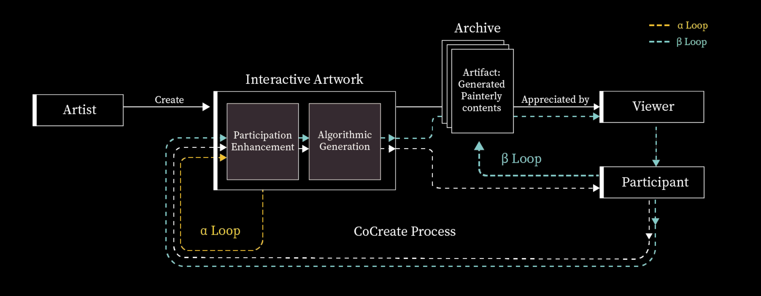By combining the concepts of Interactive Art and Generative Art, this artwork examines a new perspective on the typical process of creating and appreciating painterly content (e.g., a painter creates an artwork that is later appreciated by the audience). In Interactive Art, the Audience can be more than a Viewer; they can also be a Participant who engages with the interactive artwork. When the interactive artwork incorporates algorithmic generative capability as part of the interactive system, especially those algorithms that generate painterly content conditioned on the participant’s real-time inputs, the participant co-creates the artifact (generated painterly content) with the interactive artwork.