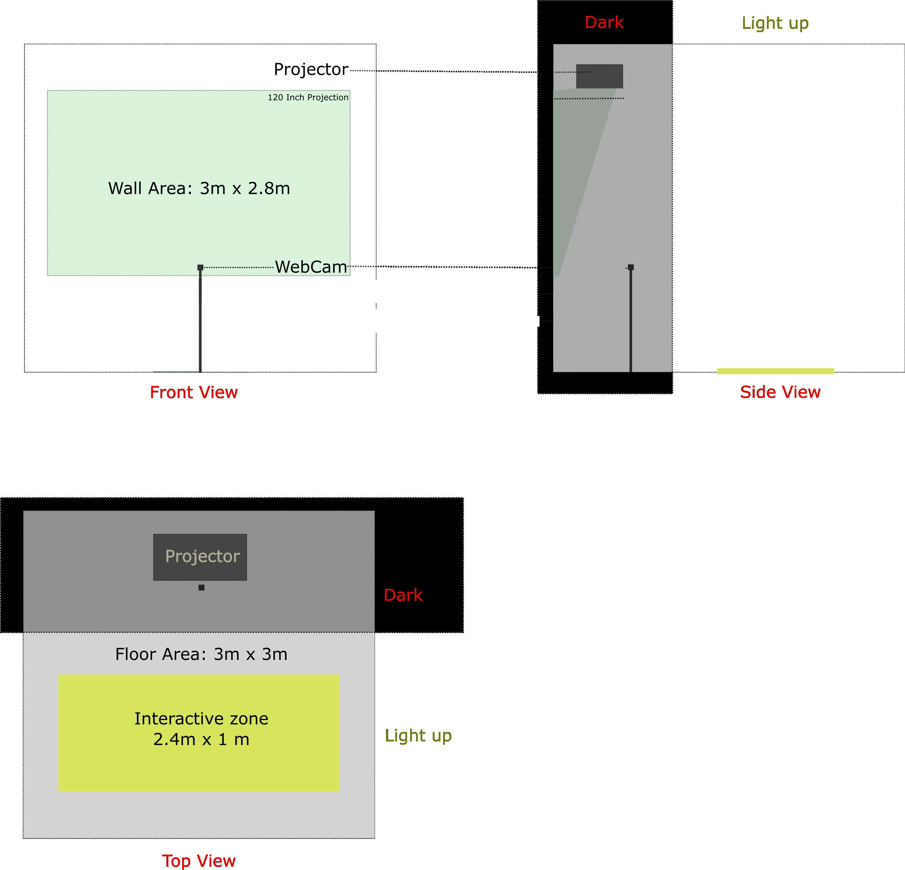 This interactive installation utilizes a live camera input and projects its output content in real time. A white-colored wall (or projection screen) in a dark environment is required for projection, while the interactive area must be well-lit to capture the audience. The audience's background must remain as clutter-free and undisturbed as possible, without any elements that could interfere with the capturing process. For example, the background cannot be a corridor that people constantly walk by.